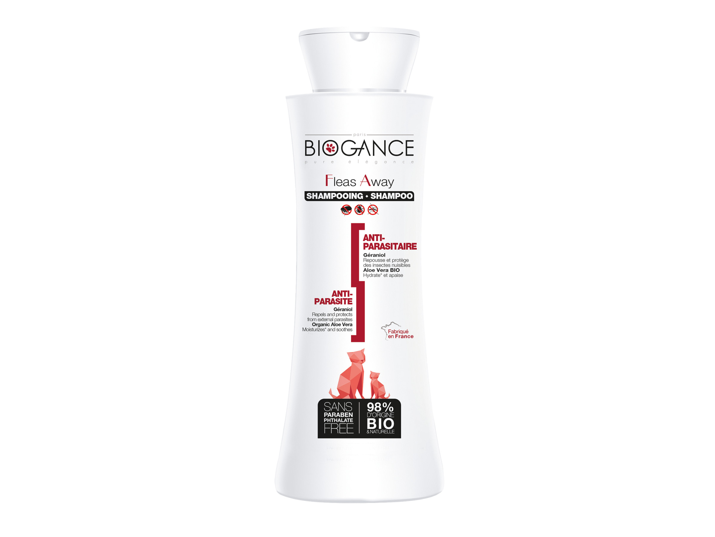 Our insect repellent shampoo for cats is formulated with Aloe Vera and essential oils of Geraniol, a natural repellant.