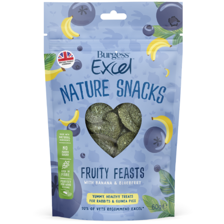 Excel Fruity Feasts are complementary healthy snacks for rabbits and guinea pigs made with tasty bananas and blueberries.