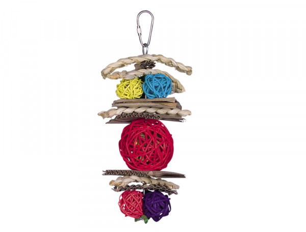 This active toy is made of paper, wicker and corn leaf. It is particularly suitable for parrots and large parakeets. The toy is 22 x 10 cm in size.