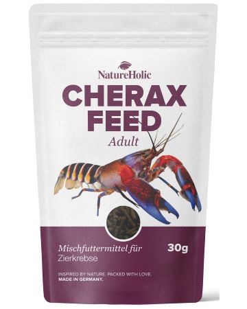 Our Natureholic© Cheraxfeed Adult is specially adapted to what adult cherax from Papua ingest in their biotopes. The basis for the composition of this crayfish food is based on scientific studies and research, as well as the experience of our long-time cherax breeders. NatureHolic Cheraxfeed Adult provides your adult Papuan shearwaters with everything they need, providing them with highly digestible plant-based proteins, minerals, nutrients and vitamins. NatureHolic Cheraxfeed Adult is naturally free of fish meal and low-quality animal meal.