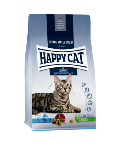 The right diet is very important to ensure a long and healthy life for your feline friend. We recommend our Happy Cat Culinary Adult dry food with spring-water trout, which was specially developed for for adult cats from 12 months. Thanks to our All in One concept, it covers your cat’s important needs. The tasty recipe contains all the vital nutrients for a long and healthy life and is especially suitable for choosy cats.