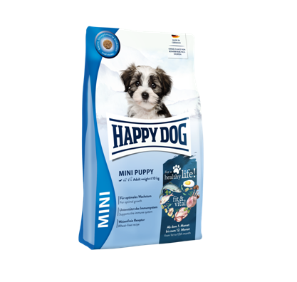 Happy Dog fit & vital Mini Puppy is ideal from 4 weeks through to 12 months. Small breeds up to 10 kg (weight of the adult dog) grow up faster and at a more even rate than large breeds. So they are fed Happy Dog Mini Puppy products from 1 to 12 months old. When your pet reaches 13 months, you should gradually change over to a suitable Adult food. We recommend Happy Dog fit & vital Mini Adult, for example.