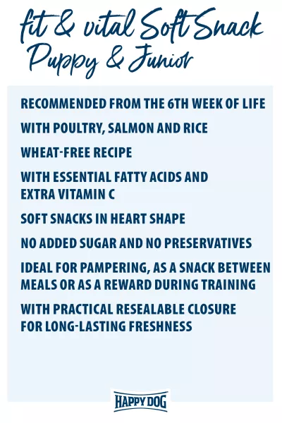 The soft, fit & vital Puppy & Junior Snack with easily digestible chicken, nutritious salmon and lamb offers puppies of medium and large breeds many moments of pleasure. Our wheat-free treats are extra vitamin C and a welcome addition to either dry or wet puppy food.
