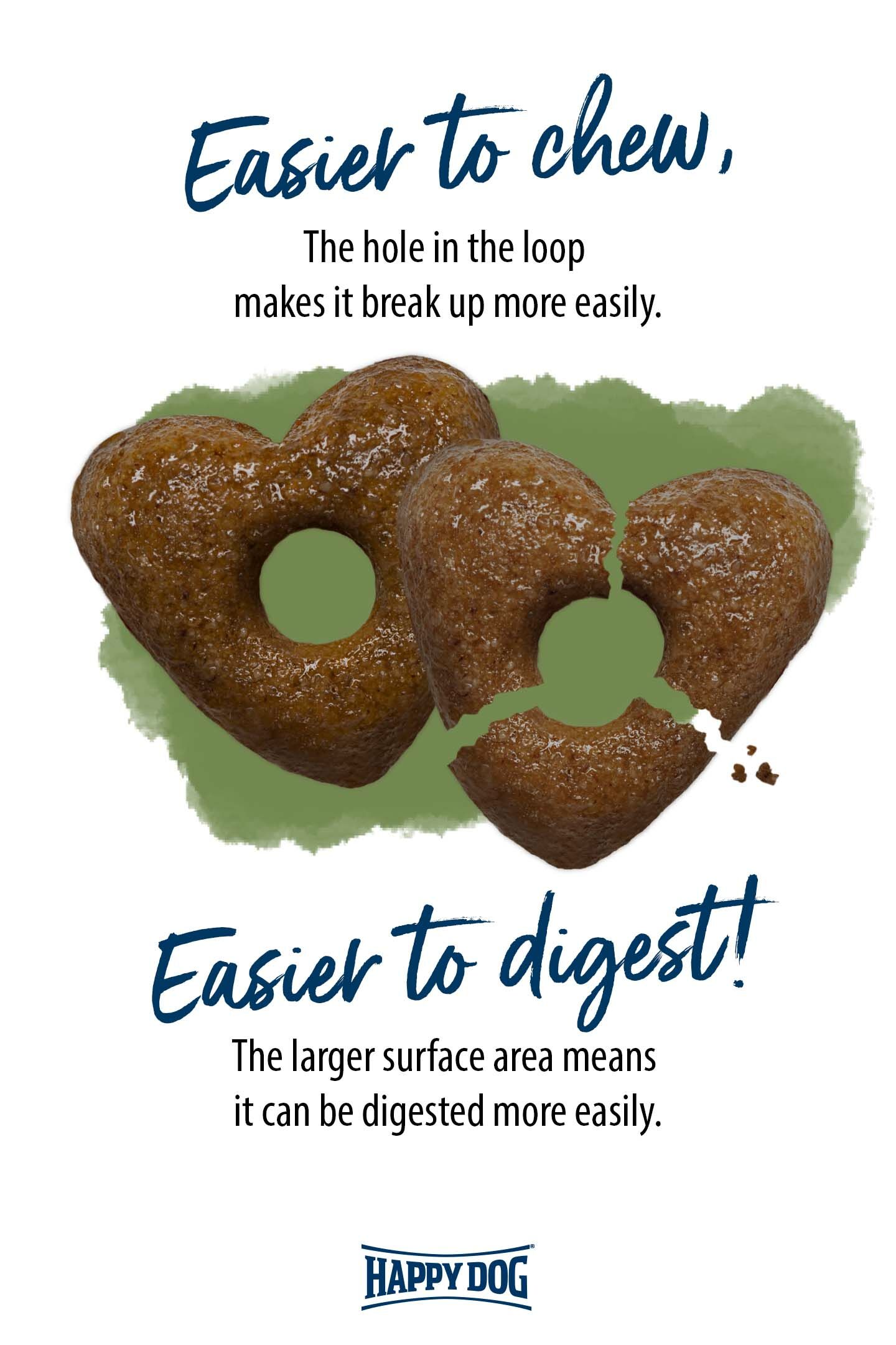 All our Young products are made as heart-shaped kibble and have a hole in the middle. The aim is to create an easily digestible dog food. The hole makes the kibble break up faster while eating – and it is easier for your dog to chew. The larger surface area also allows the digestive juices to envelop the food better in the stomach.