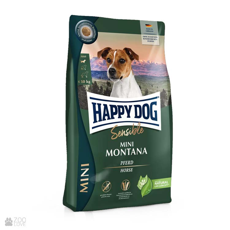 Are you looking for a special pampering experience for your little four-legged friend? Or do you have a dog with food sensitivities who tends to have digestive issues and problems with skin and coat? This may be attributable to a food intolerance. Horse as the sole animal protein source and gluten-free potatoes make Happy Dog Sensible Mini Montana a real taste sensation, even for dogs with food sensitivities. Potatoes do not contain gluten and are therefore recommended for small dogs who are grain intolerant. Horse as the unusual and exclusive protein source offers optimum digestibility. Valuable omega 3 and omega 6 fatty acids – important for a healthy skin and glossy coat – complete the exclusive recipe. This makes Sensible Mini Montana a well-balanced and ideal premium dry food for dogs with allergies or food intolerances. The exceptionally tasty super premium complete food Happy Dog Sensible Mini Montana is also ideal for all demanding little gourmets up to 10 kg who are looking for variety or are simply rather choosy. The extra small kibble is very easy to chew.