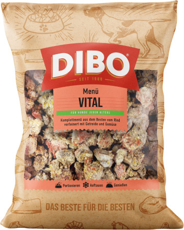 The BARF frozen food DIBO Menü-Vital contains a complete BARF mixture with everything that goes with it.