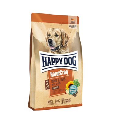 Happy Dog NaturCroq Beef & Rice is the ideal dry food with natural flavour from Bavaria. The hard-baked kibbles contain high-quality ingredients such as local beef, easily digestible rice and healthy local whole grain. Beef provides your dog with high-value animal protein, and gives them the energy they need for running around and playing. Whole-grain products are among the main suppliers of fibre. They are responsible for regulating the intestine, and they satisfy hunger and promote the digestion. They can also promote intestinal health. In addition, whole grain products supply numerous B vitamins and minerals, such as magnesium, iron, selenium and zinc, and are full of complex carbohydrates. This tasty formulation is enhanced with valuable locally-grown herbs, to provide your four-legged friend with many valuable nutrients from natural sources.