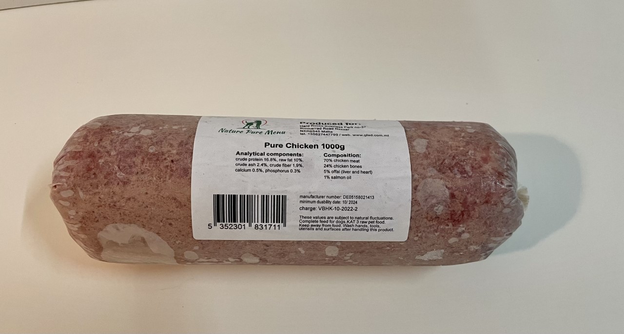 Composition; 70% chicken meat, 24% chicken bones, 5% offal (liver and heart),1% salmon