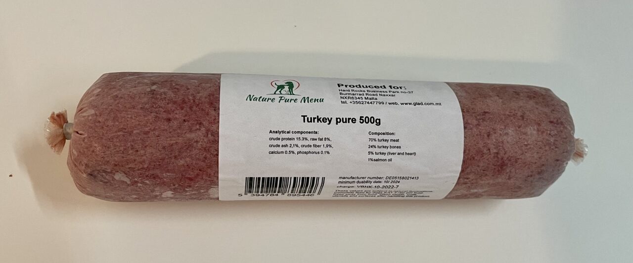 Composition; 70%Turkey meat, 24% turkey bones, 5% turkey (liver and heart), 1% Salmon oil