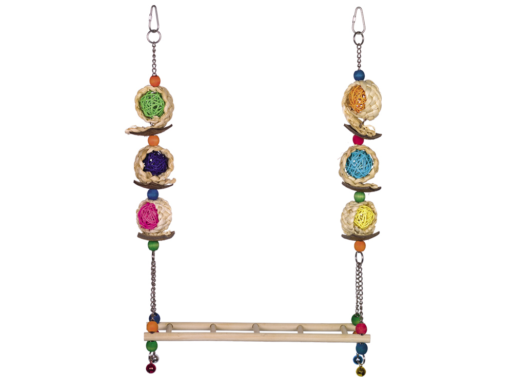 This active toy consists of a ladder swing made of wood. Elements made of coconut shell, wicker balls and corn leaves are attached to the swing. The swing also has bells. This toy is particularly suitable for parrots and large parakeets. Your animal’s natural curiosity demands variety and exciting cage accessories. The active toy is made from natural raw materials and can be easily attached to the cage