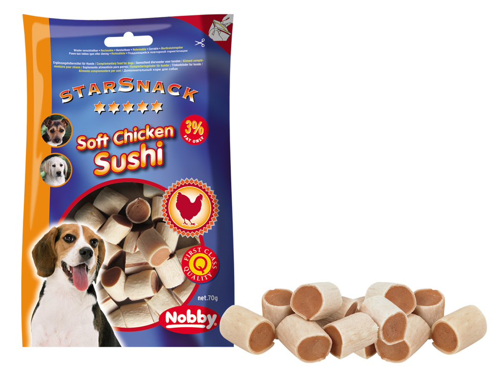 StarSnack Chicken Treats are a wonderful treat for all dogs. They consist of natural raw materials and are therefore very popular. They are delivered in a resealable freshness bag. Soft Chicken Sushi consist of 46.5% chicken, 12.2% fish and only have 3% fat!
