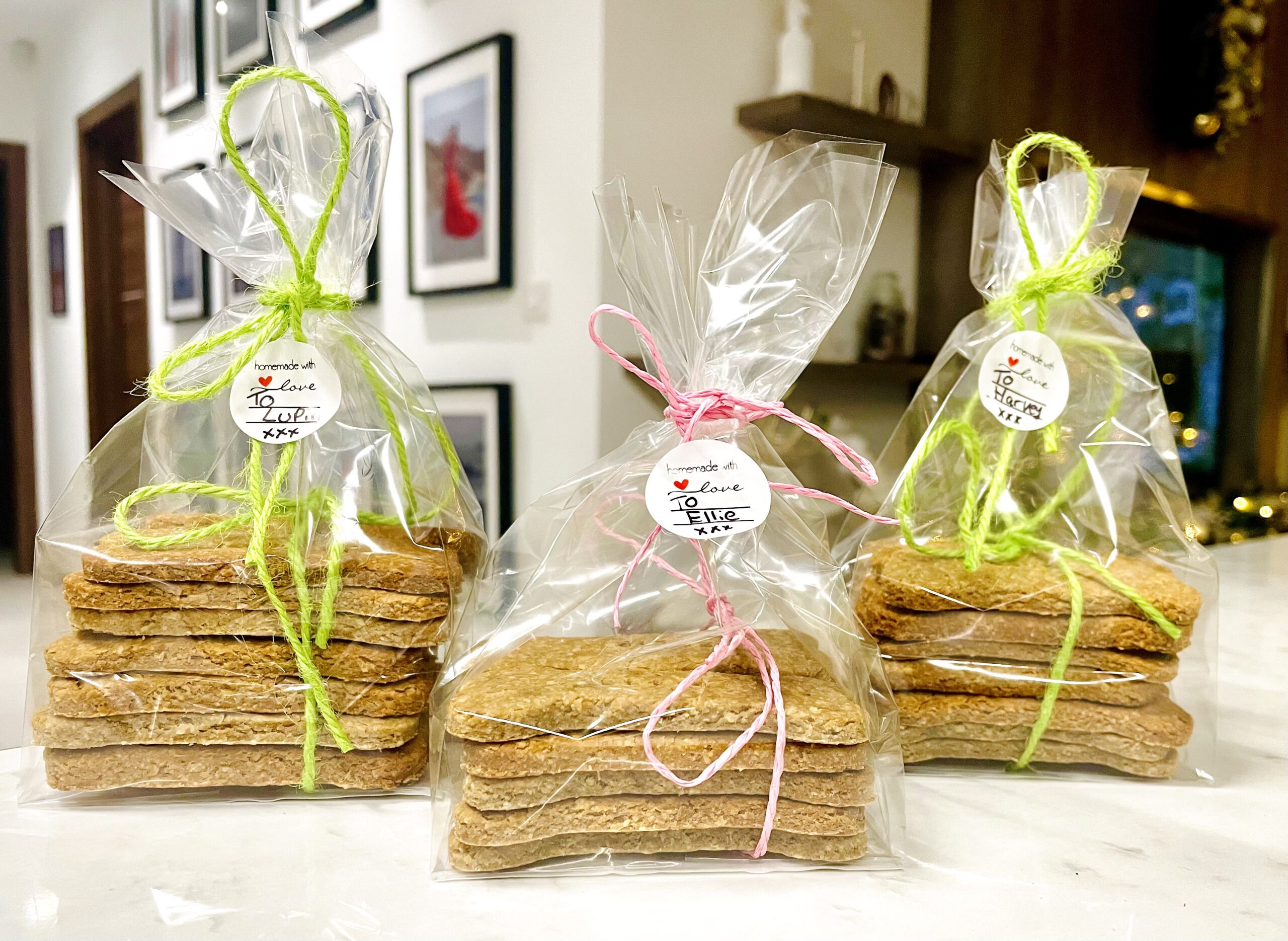 Packs of Peanut Butter & Banana treats that can be personalised with dog name