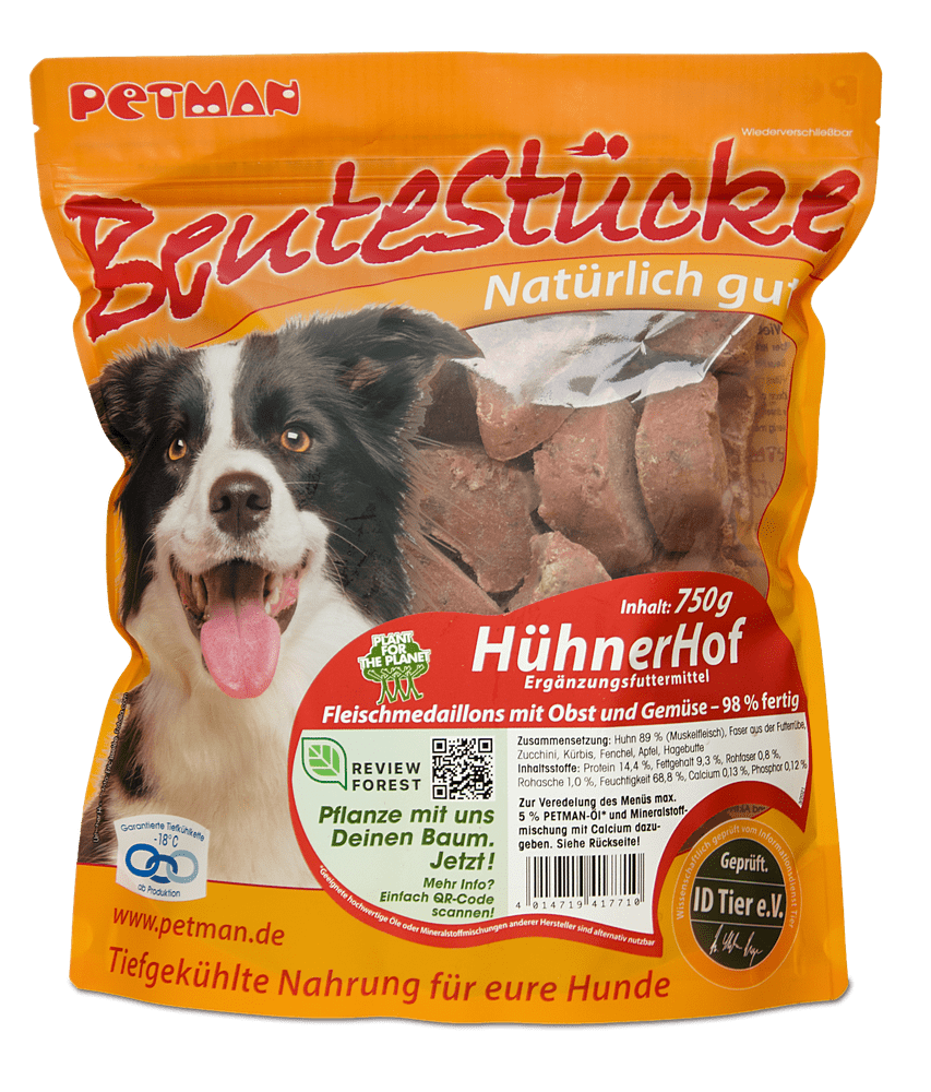The meaty pieces (of course “handmade”), about 25 g in size, consist of 89% meat and 11% fruit and vegetables.