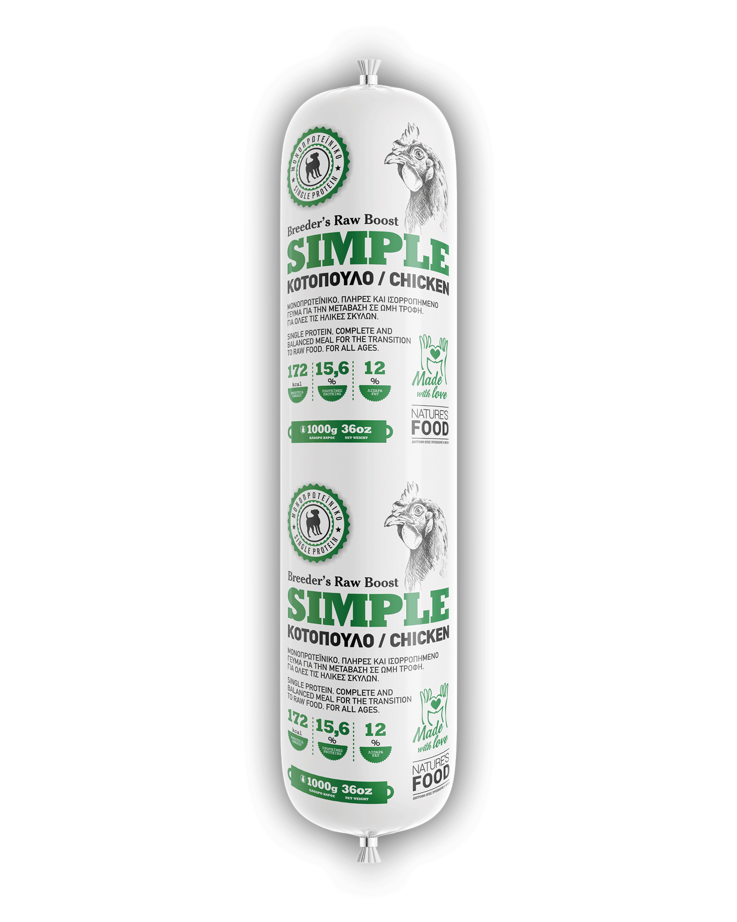 Nature’s Simple is a complete meal based on free-range chicken with the addition of fruits, in-season vegetables, oregano and chamomile. Chicken is a delicious and light option that all dogs like. Easy to digest and rich in highly nutritional protein, it provides essential amino acids that are the structural ingredients for the proper physical development of your dog. It is a source of key vitamins (A, B-1-2-3-6-12, D, E, K), iron, magnesium, zinc and other nutrients, which are vital for your dog’s wellness. Bones provide calcium and phosphorus that are vital for the development of a strong skeleton as well as chondroitin and glucosamine for healthy joints.