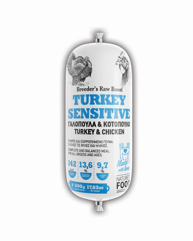 High quality raw food based on turkey for optimum health and wellness. A complete meal for dogs of all ages, especially those with troubled stomach, made of pure turkey fillet, chicken breast and leg with puréed chicken bones.
