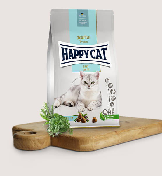 If your cat’s weight is less than 10 % above the ideal weight, vets describe this as slightly overweight. Happy Cat Sensitive Light is a good choice in this case. It is also good for cats who are very lethargic and so need a reduced-energy food, or if your cat has already been on a diet and you are looking for the right follow-on food. If your cat needs to take less exercise than usual for a short time due to an injury or operation, it is a good idea to feed Happy Cat Sensitive Light during this period to avoid weight gain.