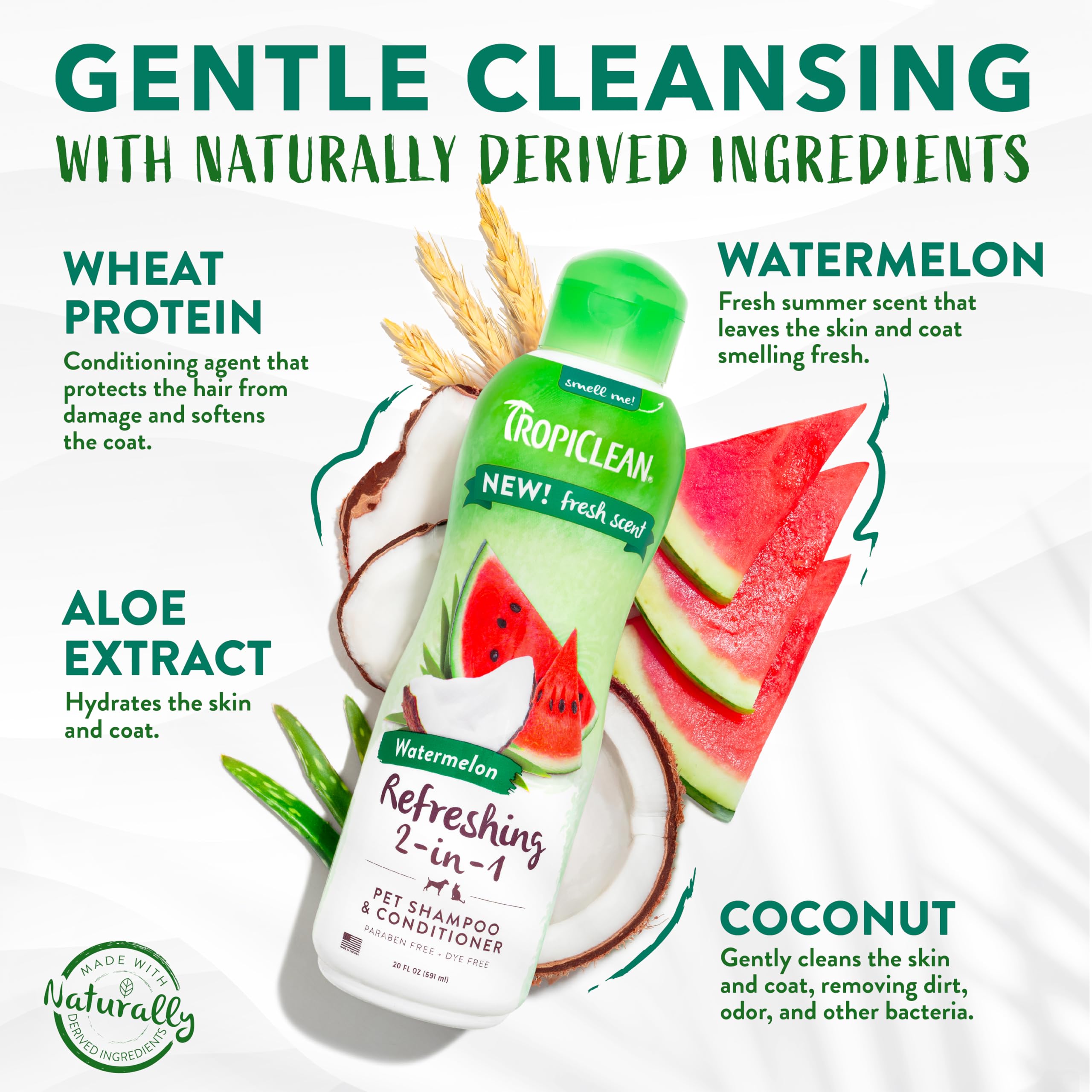 TropiClean Watermelon Refreshing 2-in-1 Pet Shampoo & Conditioner gently cleanses and moisturizes the pet’s skin and coat in a luxurious lather to help relax tangled hair for easier brushing, leaving the coat soft and healthy.
