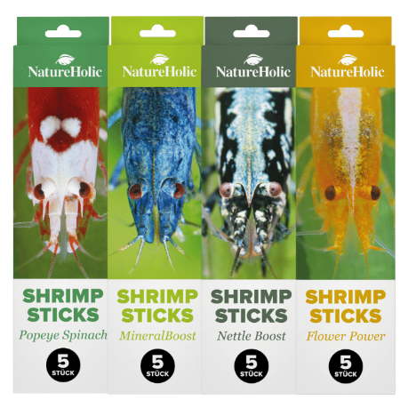 NatureHolic Shrimp Sticks are a unique series of biologically valuable, plant-based treats developed in the NatureHolic laboratory and extensively tested in their XXL shrimp facility in Mannheim, designed to delight shrimp, dwarf crayfish, and aquarium snails while supporting their health and vitality.