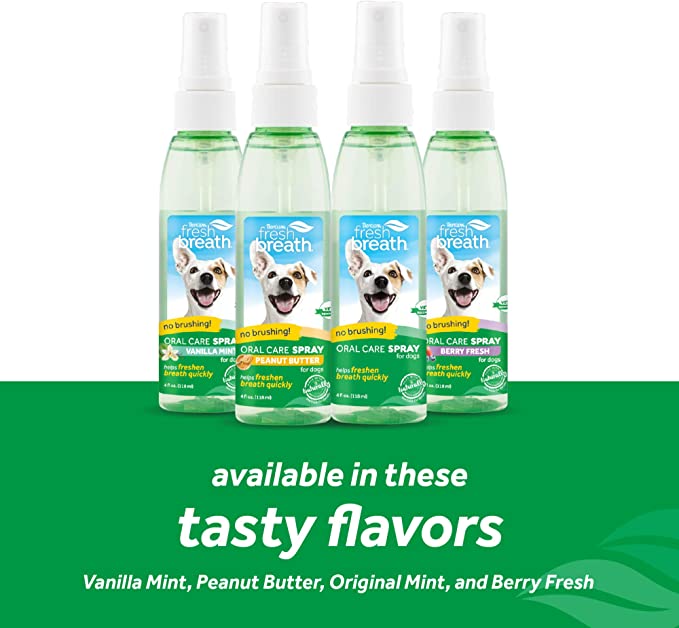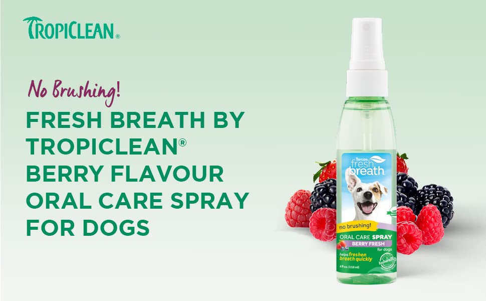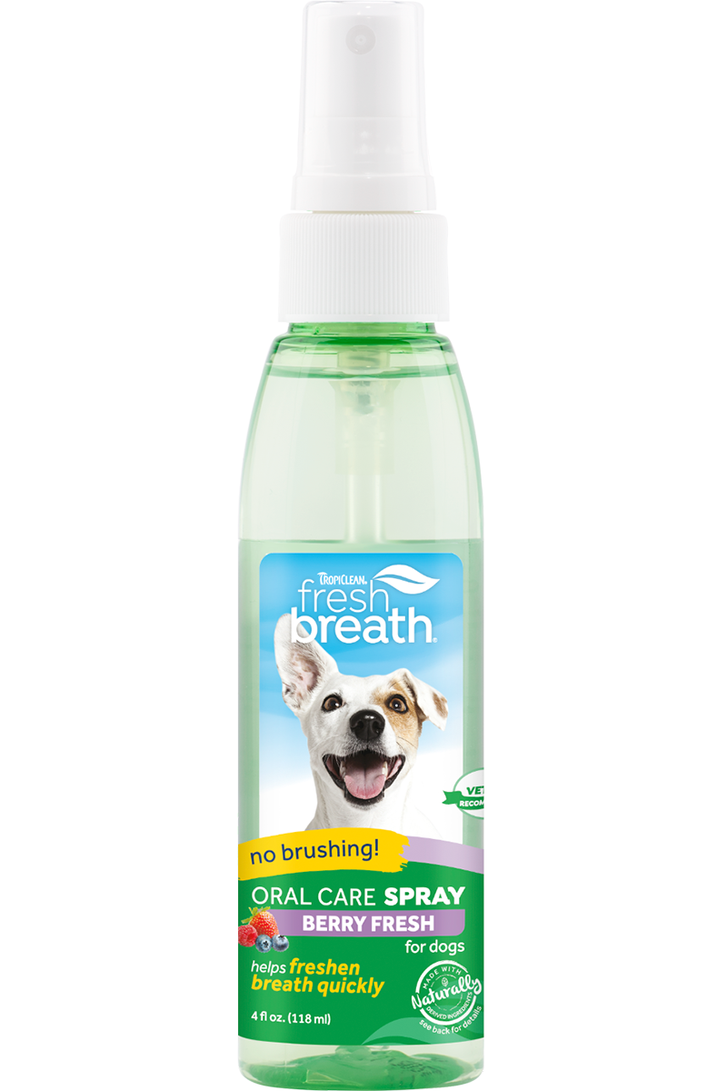 Bad breath can be one of the first signs of oral disease. In fact, 80% of dogs and 70% of cats show signs of oral disease by age 3. TropiClean Fresh Breath Berry Fresh Oral Care Spray quickly freshens breath, while supporting a bright smile, in fun flavors that dogs love. No brushing required! Simply spray into your pet’s mouth and enjoy instant fresh breath!