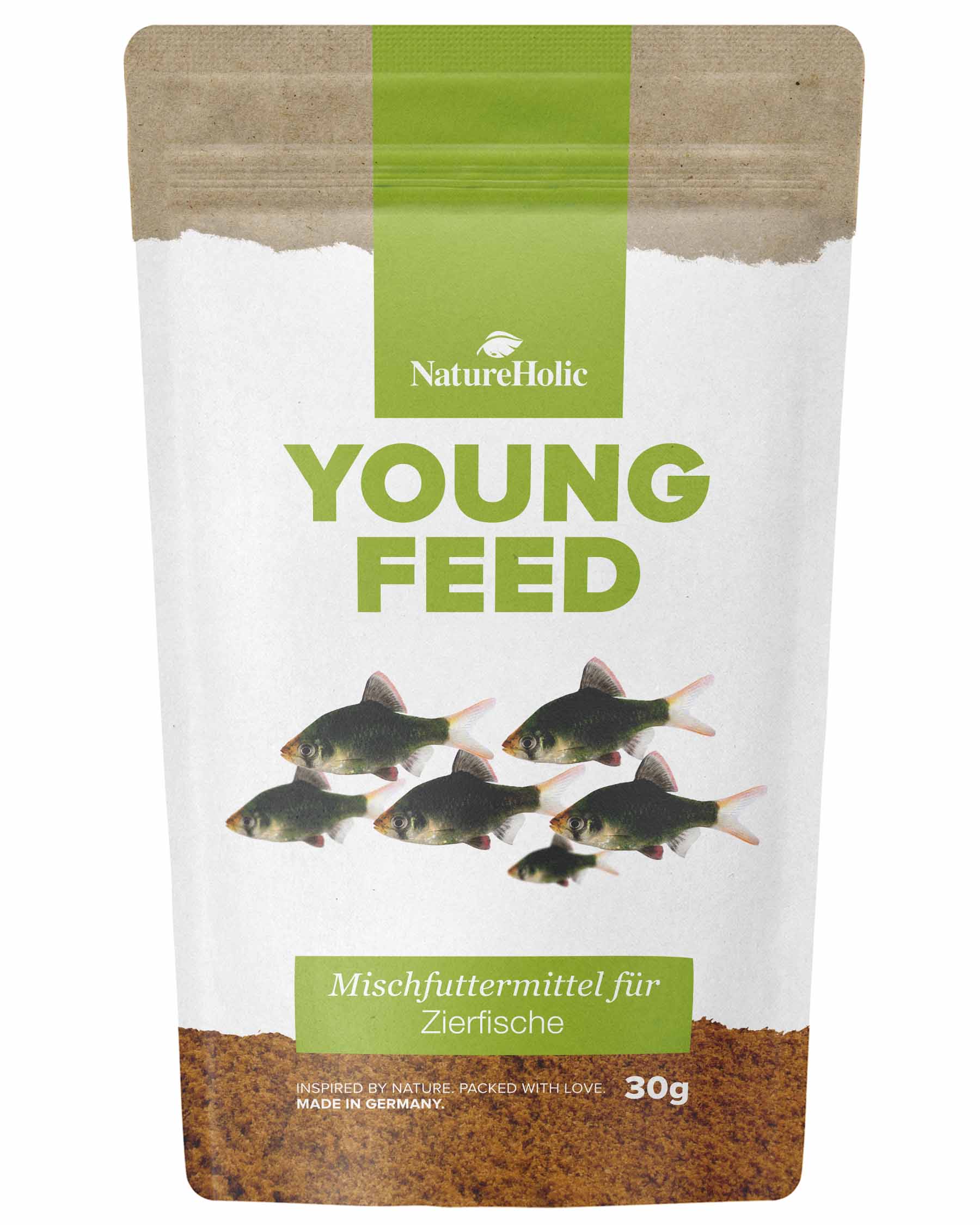 NatureHolic Youngfeed is a complete, micro-finely ground rearing food for the young of all ornamental fish species. This fine powder contains carefully selected natural algae, yeasts, and plant protein extracts that promote normal growth in fish larvae and fry while also increasing their resilience. The food’s palatability and fine texture make it highly attractive to young fish.
